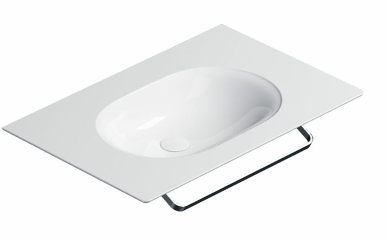 Подвесная раковина крепится к стене (крепеж в комплекте), ее можно комбинировать с открытой консолью или тумбой. Хромированный полотенцедержатель – опция по желанию, приобретается дополнительно.