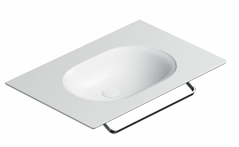 Подвесная раковина крепится к стене (крепеж в комплекте), ее можно комбинировать с открытой консолью или тумбой. Хромированный полотенцедержатель – опция по желанию, приобретается дополнительно.