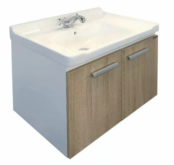 Подвесная тумба-умывальник шириной 70 см в современном стиле с двумя распашными створками для хранения принадлежностей для умывания и бытовой химии. Петли створок оснащены механизмами плавного закрывания. Фасады и корпус из влагостойкого ЛДСП. Корпус из ДСП белого цвета, фасады - дуб сонома.