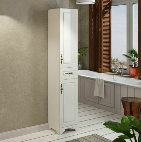 Мебель для ванной комнаты COMFORTY Тумба с одной створкой и двумя выкатными ящиками, оснащенными системой плавного закрывания. Фасады и копрус покрыты эмалью оттенка слоновая кость.