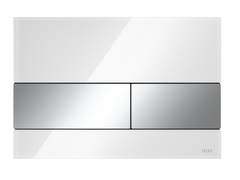 Панель смыва для смывных бачков TECE, фронтальная или верхняя установка. Плоская стеклянная панель смыва с двумя установленными на пружинах клавишами привода кулисного типа. Подходит для монтажа на уровне стены вместе с монтажной рамкой унитаза для монтажа на уровне стены (например, арт. 9240649). Совместима с контейнером для гигиенических таблеток.