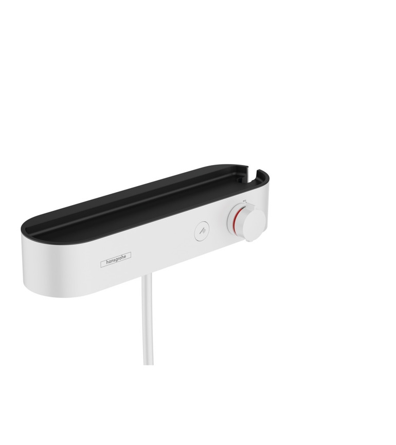 Термостат для душа немецкой фабрики HANSGROHE. Коллекция ShowerTablet Select – это термостаты для ванны с кнопочным управлением. Включение/выключение воды происходит нажатием на клавишу. Напор воды регулируется поворотной рукояткой. Термостат вплотную крепится к стене, что упрощает уход за изделием. Полочка из пластика на верхней части корпуса служит удобной подставкой для душевых принадлежностей. Встроенный держатель для ручного душа.