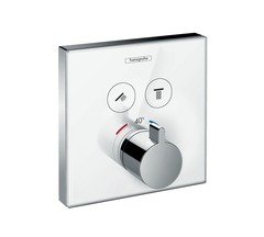 Термостат немецкой фабрики HANSGROHE со стеклянной лицевой панелью в белом цвете. Термостат с запорно -переключающим вентилем скрытого монтажа Подходит для управления 2мя потребителями воды (излив на ванну/ ручной душ, верхний душ/ручной душ и др.) Включение/выключение воды происходит нажатием на клавишу. Обе кнопки можно включать одновременно. Напор воды не регулируется, течет оптимально заданная струя.