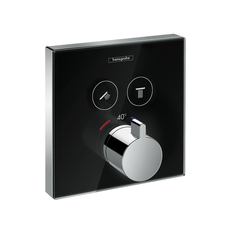Термостат немецкой фабрики HANSGROHE со стеклянной лицевой панелью в черном цвете. Термостат с запорно -переключающим вентилем скрытого монтажа Подходит для управления 2мя потребителями воды (излив на ванну/ ручной душ, верхний душ/ручной душ и др.) Включение/выключение воды происходит нажатием на клавишу. Обе кнопки можно включать одновременно. Напор воды не регулируется, течет оптимально заданная струя.