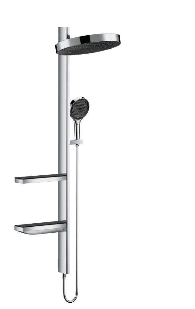 Душевая система доступна в 2 исполнениях по цвету на выбор: 26842000– все элементы в хроме, центральная часть верхнего и ручного душа из алюминия темно-серого цвета, стеклянная полочка зеркальное стекло 26842700 – все элементы в белом матовом цвете, центральная часть верхнего и ручного душа из алюминия темно-серого цвета, стеклянные полки темно-серого цвета.