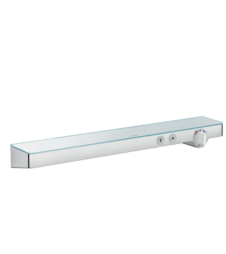 Термостат доступен в 2 исполнениях по цвету на выбор: 13184000 – все элементы в хроме, стеклянная полочка зеркальное стекло 13184400– все элементы в хроме, стеклянная полочка из белого стекла.