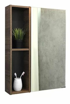 Зеркало-шкаф с пространством для открытого хранения. Створка оснащена системой плавного закрывания. Высококачественное зеркальное полотно с амальгамой на основе серебра. Фасад и корпус из влагостойкого ЛДСП дуб темно-коричневый. За створкой две горизонтальные полки. Зеркало-шкаф универсально - может быть подвешено в правом и левом варианте.