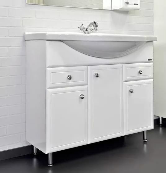 Широкая модель с обширным выбором места для хранения принадлежностей для умывания и бытовой химии. Тумба с тремя распашными дверцами и двумя ящиками. Створки оснащены петлями с плавным закрыванием. Фасады из МДФ покрыты белой глянцевой эмалью.