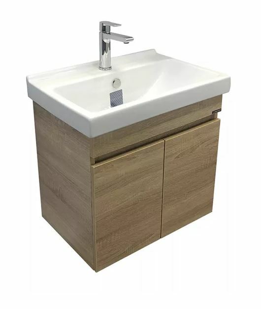 Подвесная тумба-умывальник шириной 60 см в современном стиле с двумя распашными дверцами для хранения принадлежностей для умывания и бытовой химии. Петли створок оснащены механизмами плавного закрывания. Фасады и корпус из влагостойкого ЛДСП цвета дуб сонома.