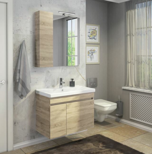 Мебель для ванной комнаты COMFORTY Подвесная тумба с левой распашной дверцей и большим выдвижным ящиком. Петли створок и направляющие ящика оснащены механизмами плавного закрывания. Фасады ящика и дверцы выполнены из одной плиты, рисунок текстуры дерева состыкован.