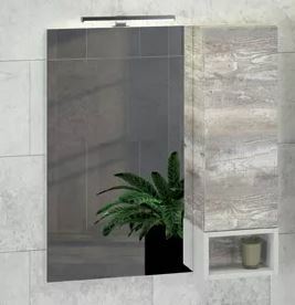 Створка мебельного элемента оснащена системой push-to-open (открытие при нажатии). Высококачественное зеркальное полотно с амальгамой на основе серебра. Дополнительно может оснащаться светильником. Фасад и корпус из влагостойкого ЛДСП Дуб бежевый. За створкой одна горизонтальная полка.