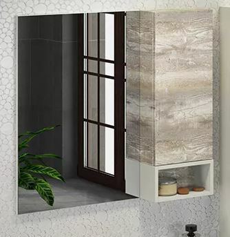 Створка оснащена системой push-to-open (открытие при нажатии). Высококачественное зеркальное полотно с амальгамой на основе серебра. Дополнительно оснащается светильником. Фасад и корпус из влагостойкого ЛДСП Дуб бежевый. За створкой одна горизонтальная полка.
