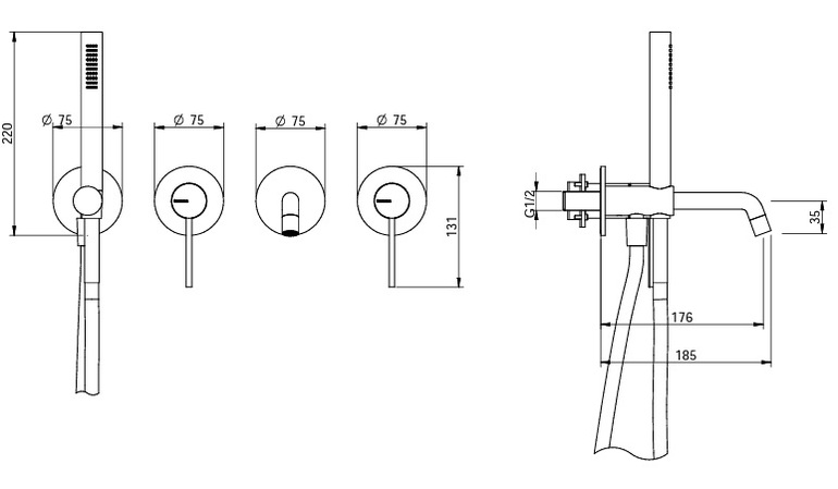 Встраиваемый смеситель для ванны из стены. Длина излива до центра аэратора 176 мм. За счет расположения аэратора под углом струя бьет вперед. Ручной душ и шланг в комплекте. Максимальный расход воды при 3 барах: 22 л/мин