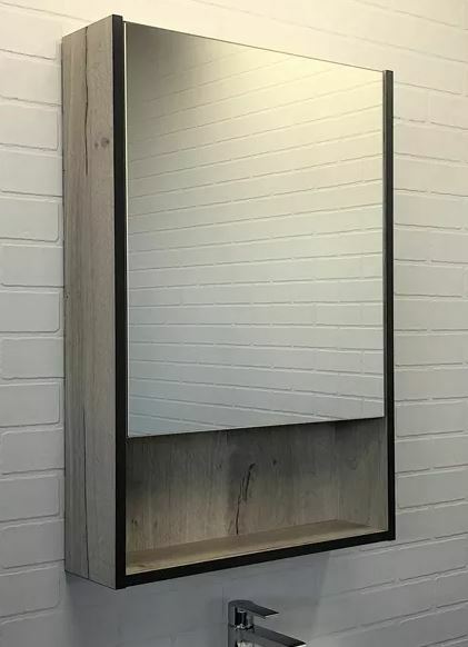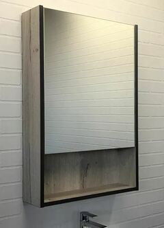 Зеркало-шкаф. Створка оснащена петлями с плавным закрыванием. За створкой одна горизонтальная полка. Высококачественное зеркальное полотно с амальгамой на основе серебра. Конструкция шкафа позволяет смонтировать зеркальную створку для открывания как вправо, так и влево.