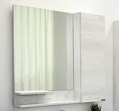 Створка оснащена петлями с плавным закрыванием. За створкой две горизонтальные полки. Высококачественное зеркальное полотно с амальгамой на основе серебра. Удобные полочки для размещения принадлежностей для умывания. Дополнительно можно укомплектовать светильником.